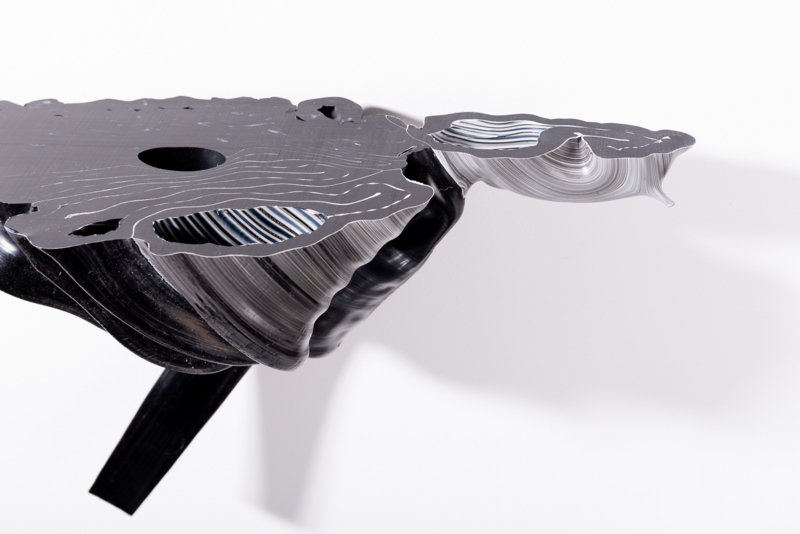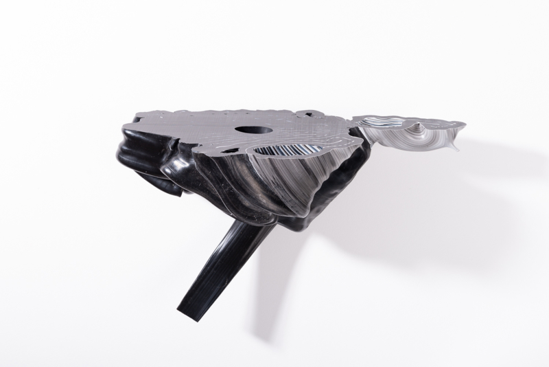 We were fascinated by the unique shapes and beautiful bright colours of neglected lumps, found at a plastic processing factory. Where we select the most striking shapes and colours, while at the same time observe as a sculptor what we can make out of it. In the process of transformation, we cut the pieces by saw or mill it with CNC. Hence it is such a surprise to find out what is hidden inside, creating an exiting moment when the marbled pattern reveals itself when the two halves split.
