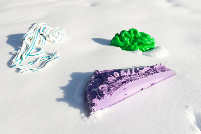 Irregular lumps of factory overproduction plastics, translated into unique and striking circular accessories for in- and outdoor.