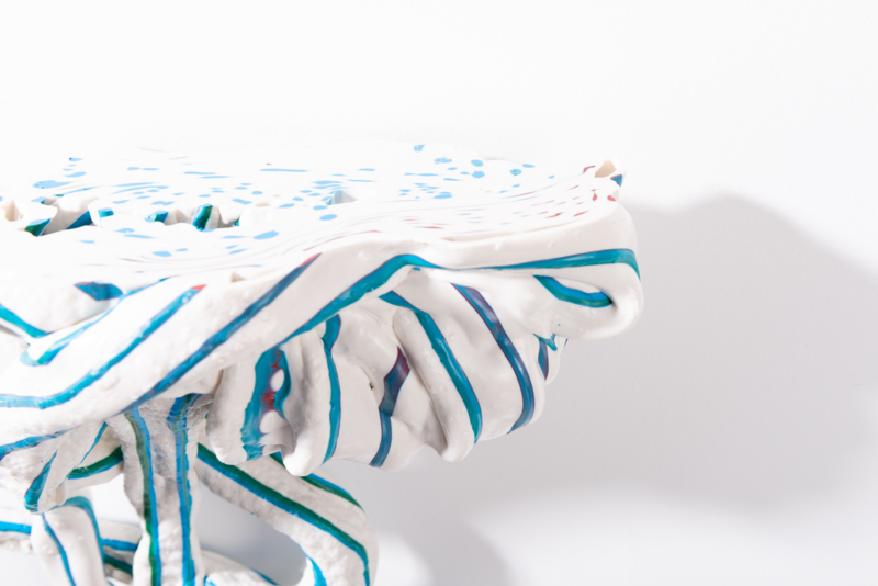 We were fascinated by the unique shapes and beautiful bright colours of neglected lumps, found at a plastic processing factory. Where we select the most striking shapes and colours, while at the same time observe as a sculptor what we can make out of it. In the process of transformation, we cut the pieces by saw or mill it with CNC. Hence it is such a surprise to find out what is hidden inside, creating an exiting moment when the marbled pattern reveals itself when the two halves split.