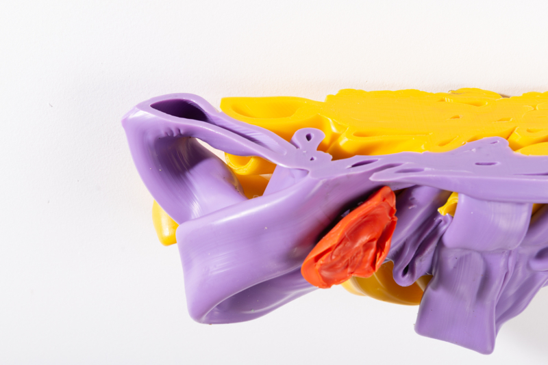 We were fascinated by the unique shapes and beautiful bright colours of neglected lumps, found at a plastic processing factory. Where we select the most striking shapes and colours, while at the same time observe as a sculptor what we can make out of it. In the process of transformation, we cut the pieces by saw or mill it with CNC. Hence it is such a surprise to find out what is hidden inside, creating an exiting moment when the marbled pattern reveals itself when the two halves split.