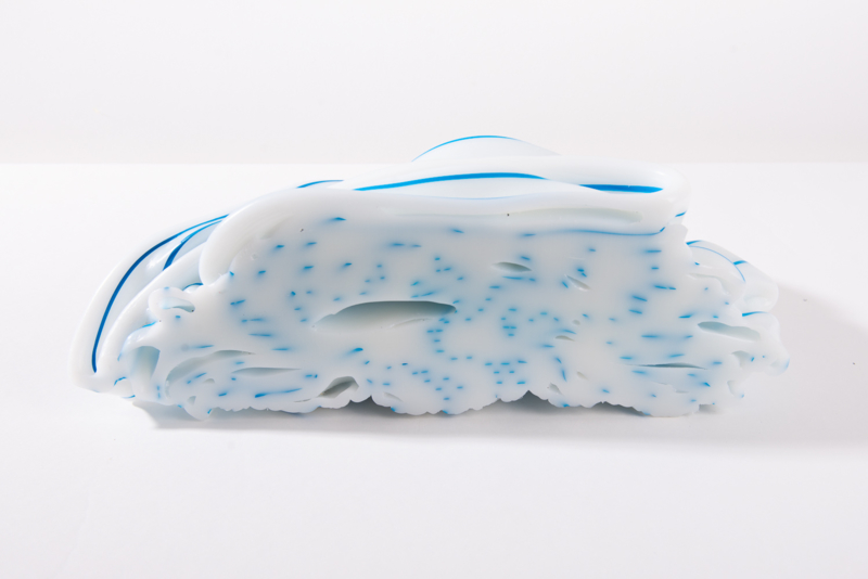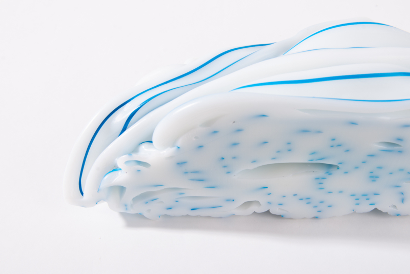 We were fascinated by the unique shapes and beautiful bright colours of neglected lumps, found at a plastic processing factory. Where we select the most striking shapes and colours, while at the same time observe as a sculptor what we can make out of it. In the process of transformation, we cut the pieces by saw or mill it with CNC. Hence it is such a surprise to find out what is hidden inside, creating an exiting moment when the marbled pattern reveals itself when the two halves split.
