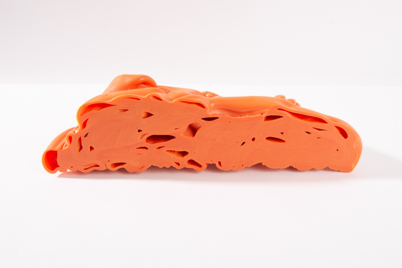 We were fascinated by the unique shapes and beautiful bright colours of neglected lumps, found at a plastic processing factory. Where we select the most striking shapes and colours, while at the same time observe as a sculptor what we can make out of it. In the process of transformation, we cut the pieces by saw or mill it with CNC. Hence it is such a surprise to find out what is hidden inside, creating an exiting moment when the marbled pattern reveals itself when the two halves split.