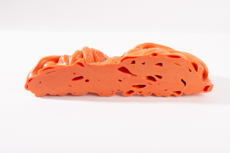 We were fascinated by the unique shapes and beautiful bright colours of neglected lumps, found at a plastic processing factory. Where we select the most striking shapes and colours, while at the same time observe as a sculptor what we can make out of it. In the process of transformation, we cut the pieces by saw or mill it with CNC. Hence it is such a surprise to find out what is hidden inside, creating an exiting moment when the marbled pattern reveals itself when the two halves split.