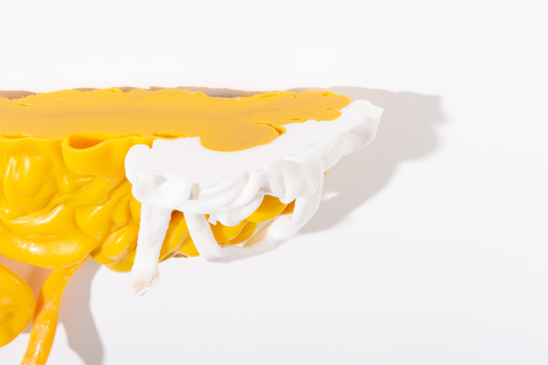 We were fascinated by the unique shapes and beautiful bright colours of neglected lumps, found at a plastic processing factory. Where we select the most striking shapes and colours, while at the same time observe as a sculptor what we can make out of it. In the process of transformation, we cut the pieces by saw or mill it with CNC. Hence it is such a surprise to find out what is hidden inside, creating an exiting moment when the marbled pattern reveals itself when the two halves split.