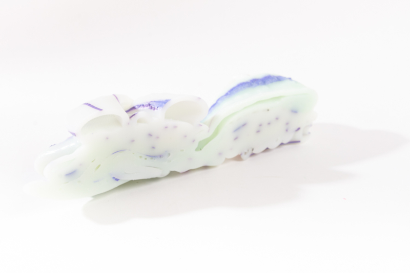 We were fascinated by the unique shapes and beautiful bright colours of neglected lumps, found at a plastic processing factory. Where we select the most striking shapes and colours, while at the same time observe as a sculptor what we can make out of it. In the process of transformation, we cut the pieces by saw or mill it with CNC. Hence it is such a surprise to find out what is hidden inside, creating an exiting moment when the marbled pattern reveals itself when the two halves split.