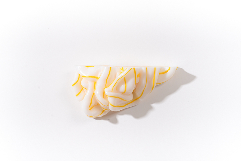 We were fascinated by the unique shapes and beautiful bright colours of neglected lumps, found at a plastic processing factory. Where we select the most striking shapes and colours, while at the same time observe as a sculptor what we can make out of it. In the process of transformation, we cut the pieces by saw or mill it with CNC. Hence it is such a surprise to find out what is hidden inside, creating an exiting moment when the marbled pattern reveals itself when the two halves split.