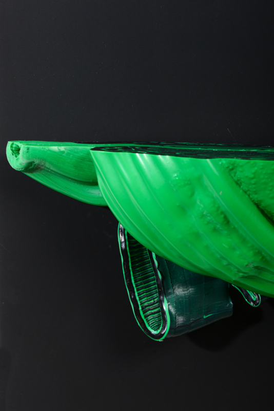We were fascinated by the unique shapes and beautiful bright colours of neglected lumps, found at a plastic processing factory. Where we select the most striking shapes and colours, while at the same time observe as a sculptor what we can make out of it. In the process of transformation, we cut the pieces by saw or mill it with CNC. Hence it is such a surprise to find out what is hidden inside, creating an exiting moment when the marbled pattern reveals itself when the two halves split.