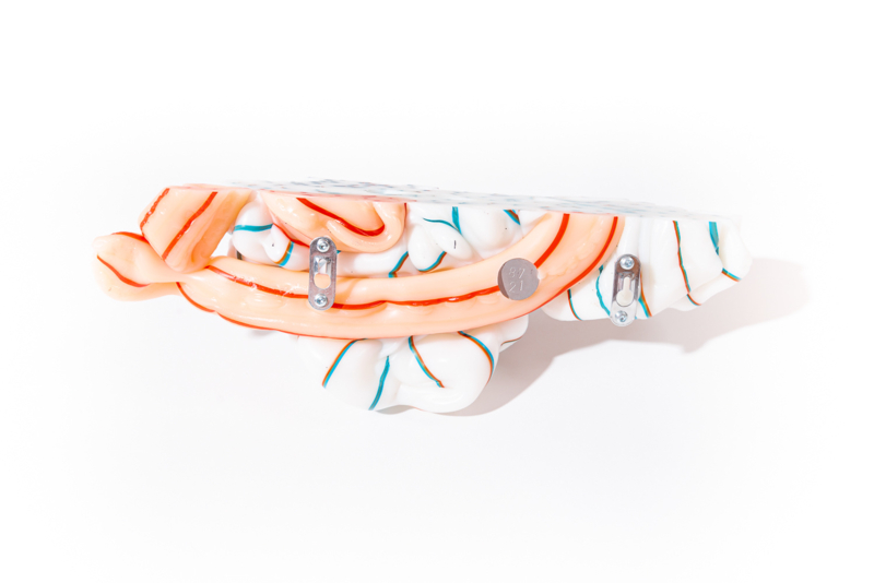 We were fascinated by the unique shapes and beautiful bright colours of neglected lumps, found at a plastic processing factory. Where we select the most striking shapes and colours, while at the same time observe as a sculptor what we can make out of it. In the process of transformation, we cut the pieces by saw or mill it with CNC. Hence it is such a surprise to find out what is hidden inside, creating an exiting moment when the marbled pattern reveals itself when the two halves split.