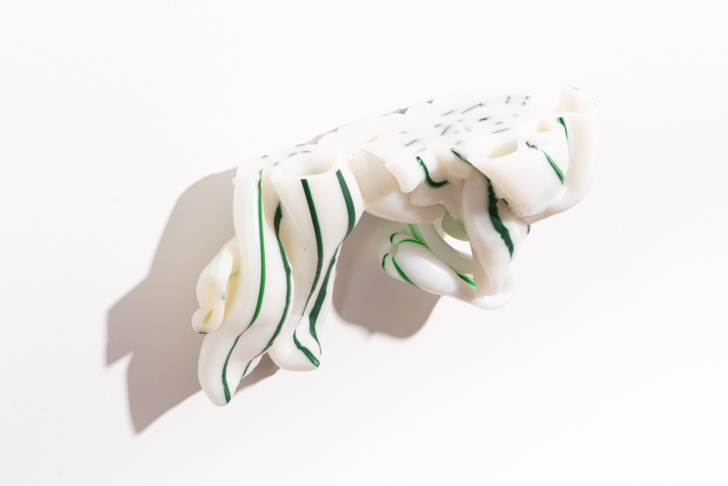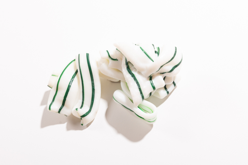 We were fascinated by the unique shapes and beautiful bright colours of neglected lumps, found at a plastic processing factory. Where we select the most striking shapes and colours, while at the same time observe as a sculptor what we can make out of it. In the process of transformation, we cut the pieces by saw or mill it with CNC. Hence it is such a surprise to find out what is hidden inside, creating an exiting moment when the marbled pattern reveals itself when the two halves split.