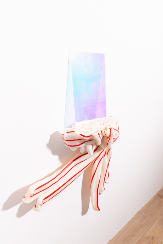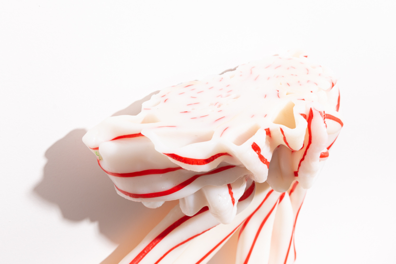 We were fascinated by the unique shapes and beautiful bright colours of neglected lumps, found at a plastic processing factory. Where we select the most striking shapes and colours, while at the same time observe as a sculptor what we can make out of it. In the process of transformation, we cut the pieces by saw or mill it with CNC. Hence it is such a surprise to find out what is hidden inside, creating an exiting moment when the marbled pattern reveals itself when the two halves split.