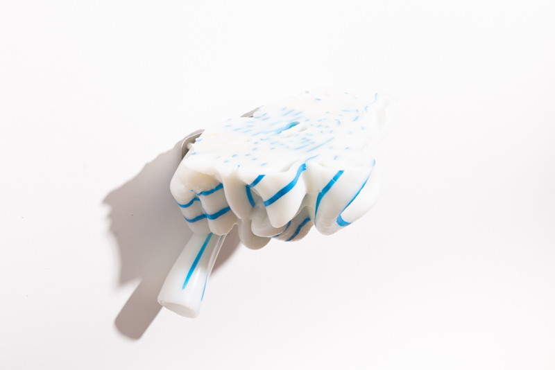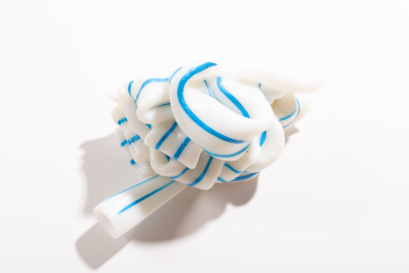 We were fascinated by the unique shapes and beautiful bright colours of neglected lumps, found at a plastic processing factory. Where we select the most striking shapes and colours, while at the same time observe as a sculptor what we can make out of it. In the process of transformation, we cut the pieces by saw or mill it with CNC. Hence it is such a surprise to find out what is hidden inside, creating an exiting moment when the marbled pattern reveals itself when the two halves split.