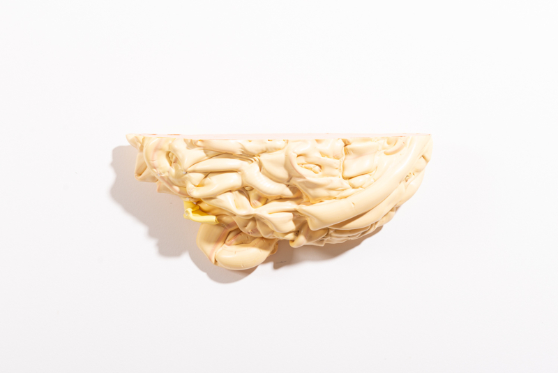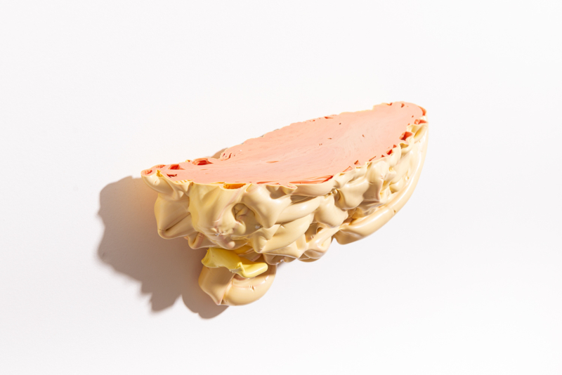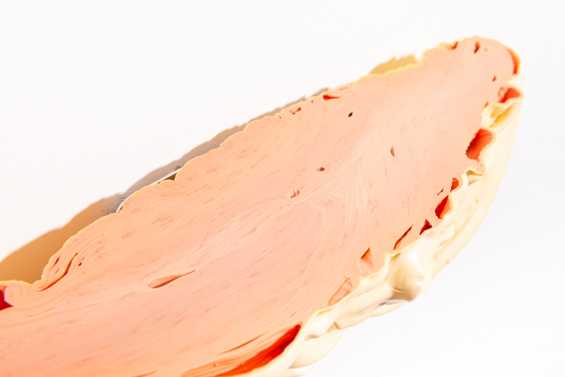 We were fascinated by the unique shapes and beautiful bright colours of neglected lumps, found at a plastic processing factory. Where we select the most striking shapes and colours, while at the same time observe as a sculptor what we can make out of it. In the process of transformation, we cut the pieces by saw or mill it with CNC. Hence it is such a surprise to find out what is hidden inside, creating an exiting moment when the marbled pattern reveals itself when the two halves split.