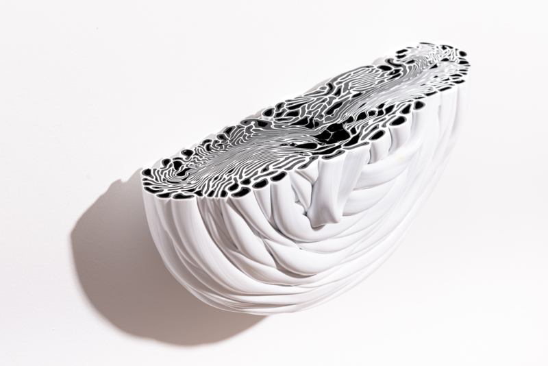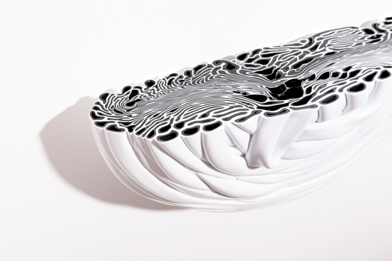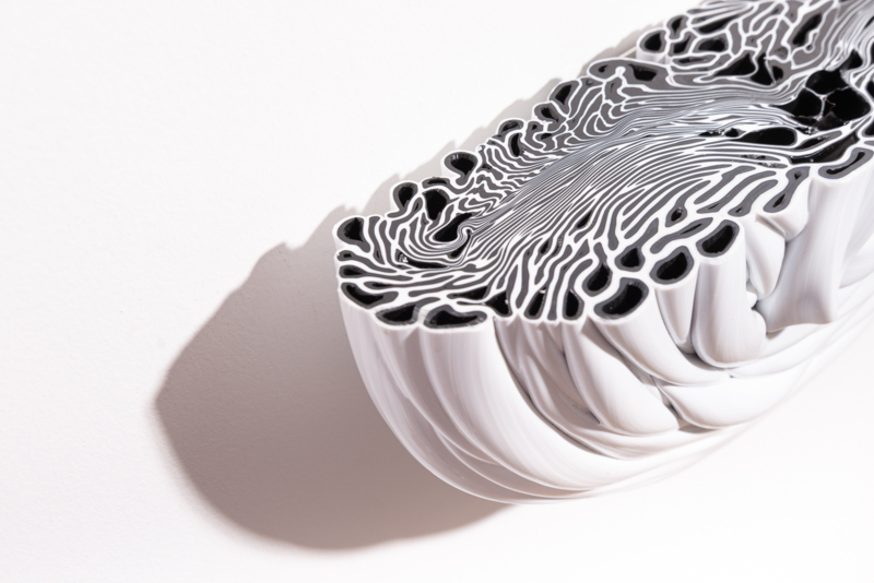 We were fascinated by the unique shapes and beautiful bright colours of neglected lumps, found at a plastic processing factory. Where we select the most striking shapes and colours, while at the same time observe as a sculptor what we can make out of it. In the process of transformation, we cut the pieces by saw or mill it with CNC. Hence it is such a surprise to find out what is hidden inside, creating an exiting moment when the marbled pattern reveals itself when the two halves split.