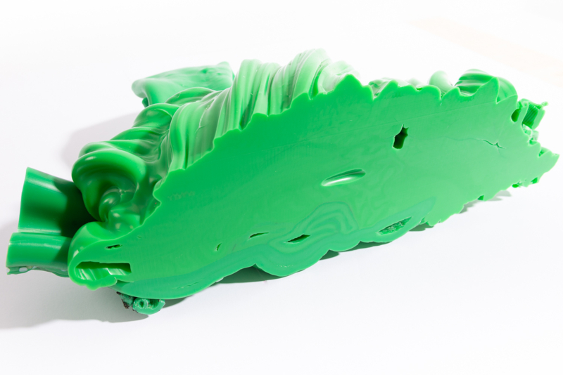 We were fascinated by the unique shapes and beautiful bright colours of neglected lumps, found at a plastic processing factory. Where we select the most striking shapes and colours, while at the same time observe as a sculptor what we can make out of it. In the process of transformation, we cut the pieces by saw or mill it with CNC. Hence it is such a surprise to find out what is hidden inside, creating an exiting moment when the marbled pattern reveals itself when the two halves split.