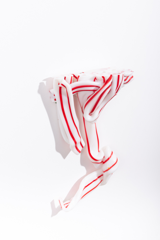We were fascinated by the unique shapes and beautiful bright colours of neglected lumps, found at a plastic processing factory. Where we select the most striking shapes and colours, while at the same time observe as a sculptor what we can make out of it. In the process of transformation, we cut the pieces by saw or mill it with CNC. Hence it is such a surprise to find out what is hidden inside, creating an exiting moment when the marbled pattern reveals itself when the two halves split.