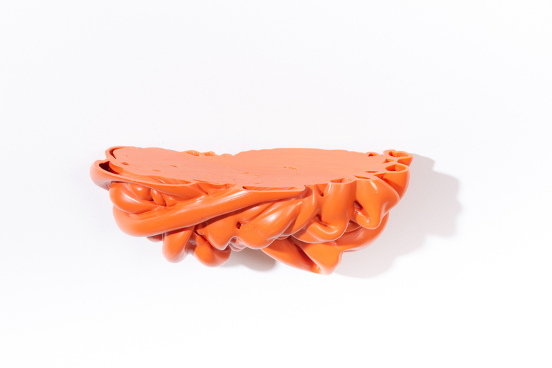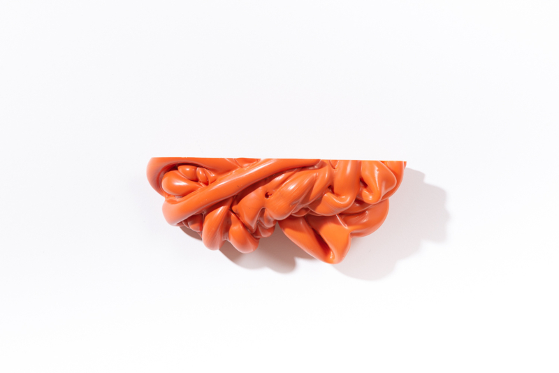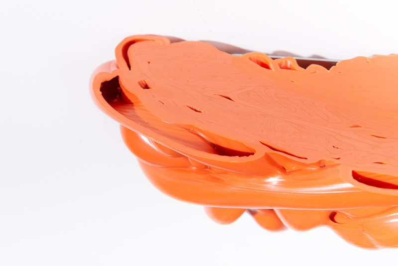 We were fascinated by the unique shapes and beautiful bright colours of neglected lumps, found at a plastic processing factory. Where we select the most striking shapes and colours, while at the same time observe as a sculptor what we can make out of it. In the process of transformation, we cut the pieces by saw or mill it with CNC. Hence it is such a surprise to find out what is hidden inside, creating an exiting moment when the marbled pattern reveals itself when the two halves split.